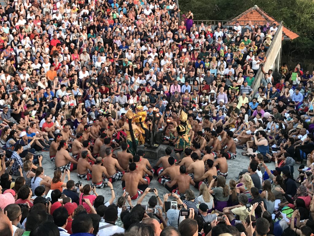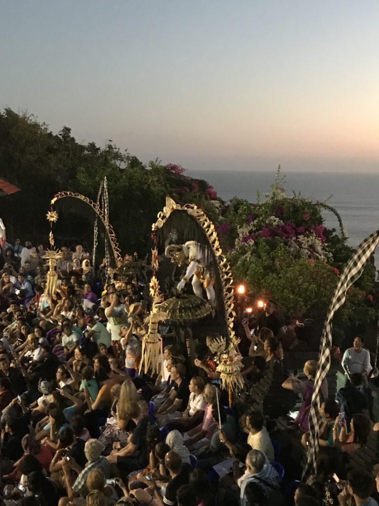 - Our visit to Pura Luhur Uluwatu Temple was the highlight of our time here. We arrived around 4:15 for the Kecak dance performance. The dance is based on the famous epic Hindu story of the Ramayana and is a must on your visit to Indonesia. The dance happens nightly at sunset, but fills up quickly so arrive early to get a good seat! We sat in the upper left hand section. Due to that, we were granted us a perfect view of the performance and of the sunset over the ocean. The temple is located on a cliff and boasts beautiful ocean views!